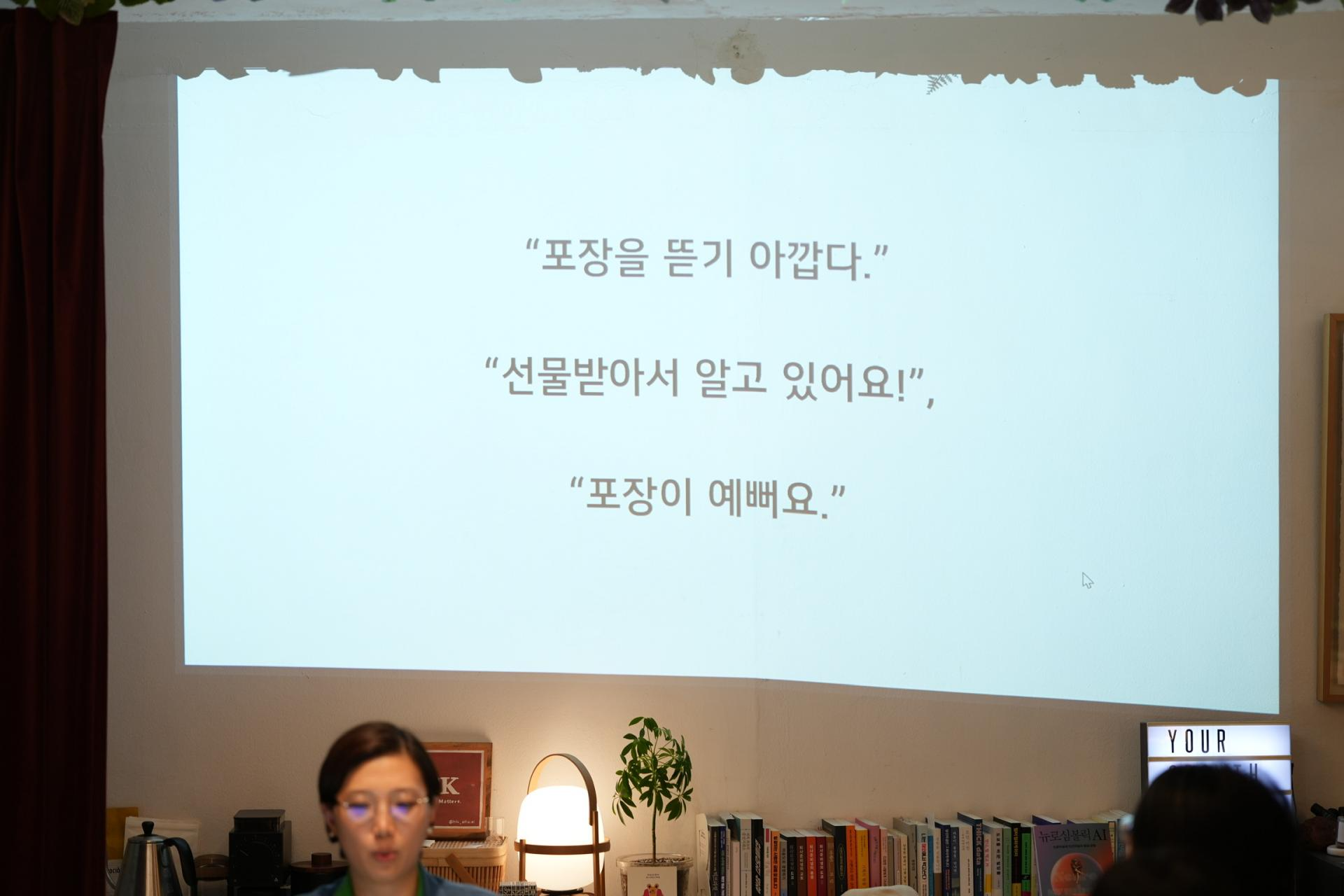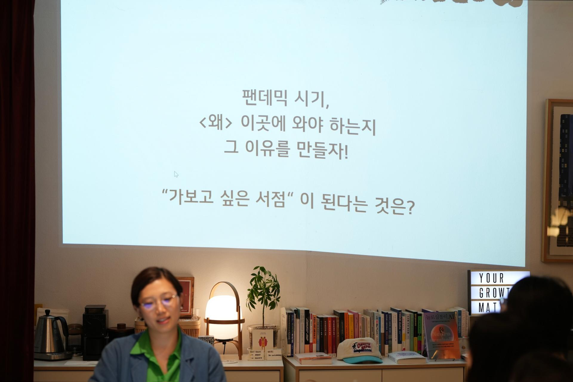 “좁은 공간에서 손님과 거리를 어떻게 조율하나요?”, “서점 대표와 브랜드가 동일시되는 상황을 어떻게 생각하시나요?” 같은 질문들이 이어졌습니다. 지나님은 무거운 가방을 내려놓으라고 권하는 작은 배려가 손님의 표정을 바꾸는 순간을 예로 들며, 공간 안에서 손님과 자연스럽게 관계가 만들어진다고 답했습니다.