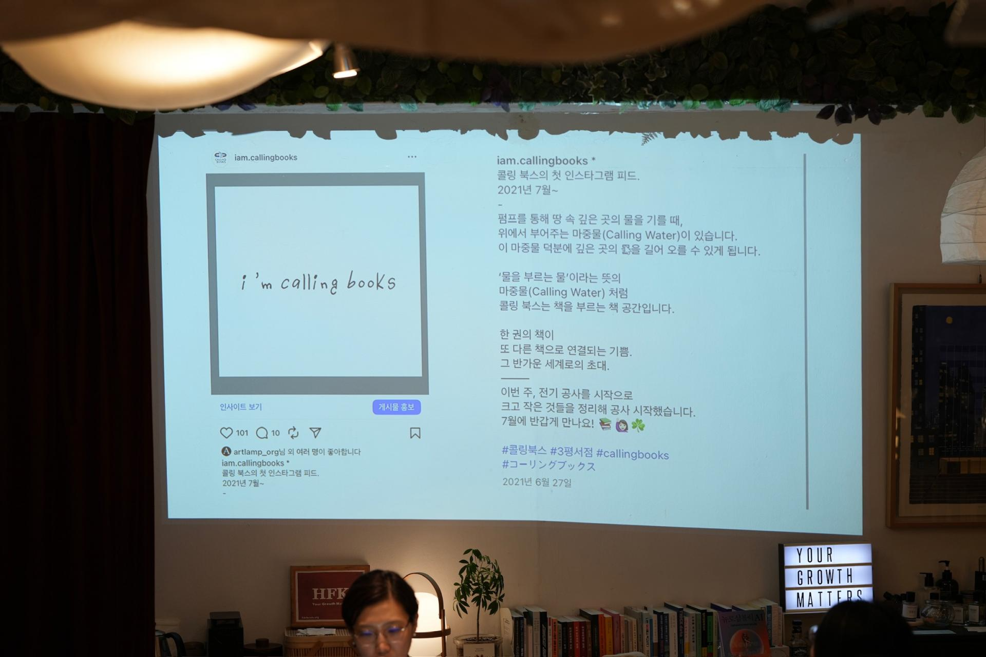 브랜드씽킹 팀 멤버이자 콜링북스의 대표 지나님은 서점을 열기 전부터 서점 운영자가 꿈이었던 사람은 아니었다고 말했습니다. 국문학을 전공한 그녀는 라디오를 좋아해 방송 작가로 프리랜서 일을 했고, 어머니의 긴 투병과 별세를 겪으면서 책을 삶의 중심에 두고 싶다는 결심을 하게 되었다고 했습니다. 그리고 2021년 ‘콜링북스’라는 이름으로 작은 공간을 열게 되었습니다. 팬데믹이 한창이었던 시기에 오픈했기에 “사람들이 왜 이 점에 와야 하는지”를 끊임없이 고민했고, 책을 파는 곳이기 이전에 기억에 남는 경험을 주는 공간이 되도록 노력했습니다.