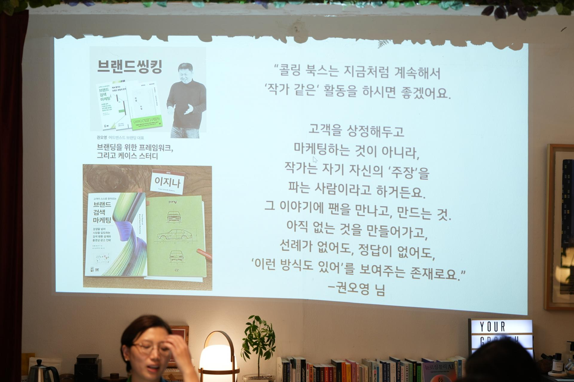 브랜드토크에서는 작은 서점이 어떻게 4년 동안 수많은 실험을 이어왔는지를 보여줬습니다. 콜링북스는 책 판매에만 머물지 않고, 향, 전시, 협업, 메일링 등 다양한 시도로 책과 사람을 이어왔습니다. 멤버들은 이 과정을 통해 브랜드와 콜라보레이션에 필요한 네트워크가 어떻게 만들어지고 확장되는지를 가까이에서 확인했습니다.