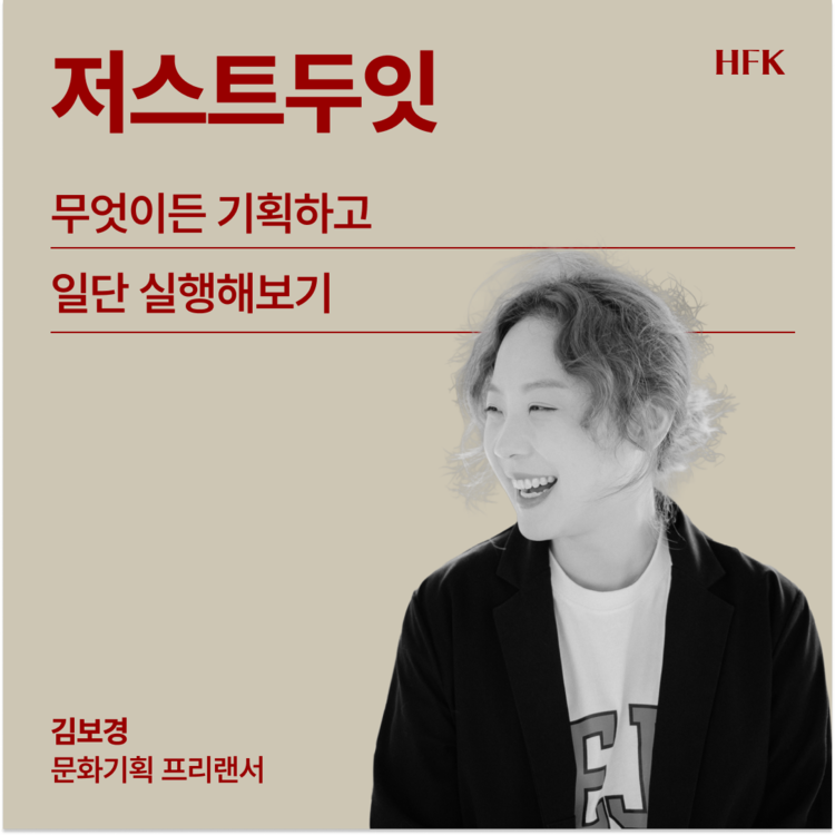 조직에서 잘 버티는 것이 중요해지는 시대라도, 누군가에게 '액션'을 만들어 주는 사람이 필요합니다. 그러한 사람을 떠올렸을 때 바로 보경님이 생각났습니다. 보경님께 기획안을 요청드렸고, 보내주신 기획안은 많이 고치지 않았습니다. HFK의 톤앤 매너로 고치면 고칠수록, 보경님의 색이 옅어졌기 때문입니다. 조직 속에서 직장인의 언어로 살아가는 멤버들이 문화 예술 씬에서 자신만의 영역을 일궈가며 성장해온 파트너의 언어를 고스란히 느끼길 바랍니다. 그러면 오히려 뭐라도 '시도'해 볼 마음이 싹트지 않을까 싶더라고요.