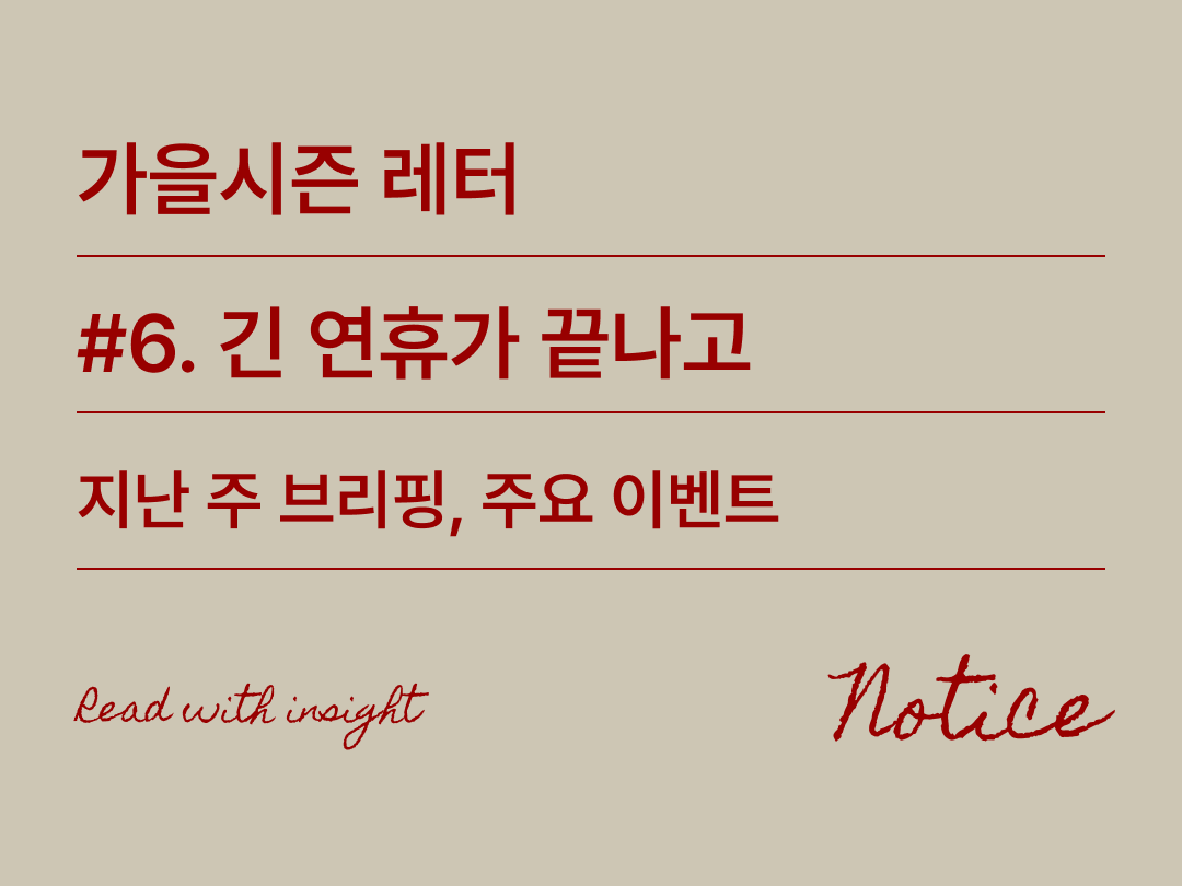 긴 연휴 동안 자기만의 시간 충분히 보내셨나요? 긴 연휴가 왠지 모르게 허무히 끝난 것 같아 마음의 짐은 여전히 남아있는듯 하네요.
