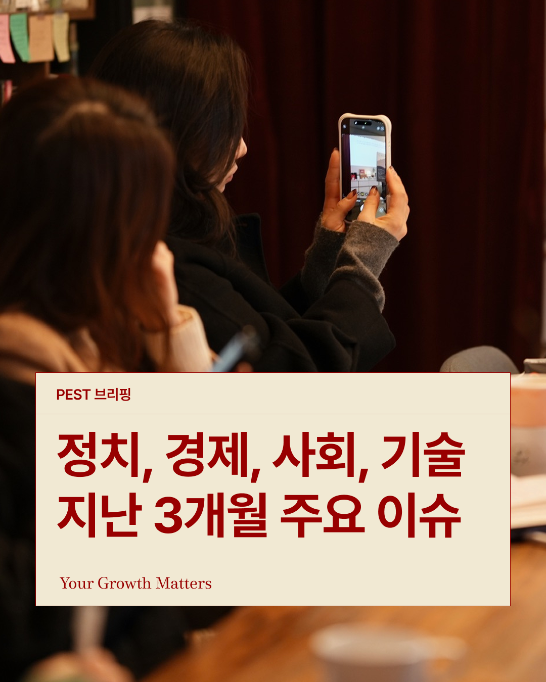 | 📢 겨울시즌 PEST 브리핑 PEST 브리핑은 한 달에 한 번, 정치/경제/사회문화/기술 영역의 주요 이슈를 선별해 거시적 시각을 전달하는 세미나입니다. 각 분야별 전담 큐레이터들이 비즈니스 외부환경의 변화를 정리하고 위기와 기회를 소개합니다. P 정치 – 이강원 / 변호사, 메인테인CSO E 경제 – 민선홍 / PEF 이사 S 사회 – 권오영 / 전 메타브랜딩 이사 T 기술 – 김유연 / AWS